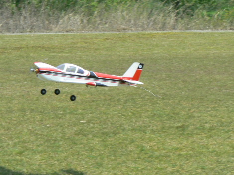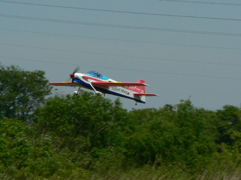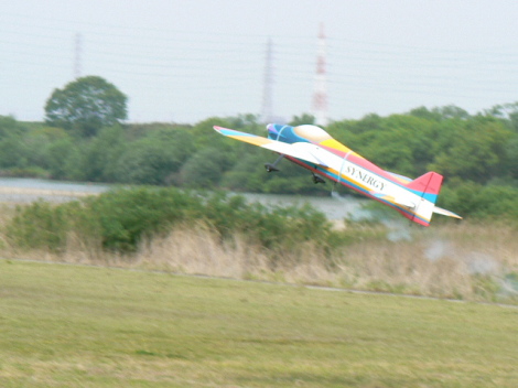 | 朝早くからスタント開始です 飛ばすのは、近藤さん。 やる気だけは、凄いやる気があります さすがの僕でも飛ばさない超強風の後ろ風でも飛ばします ファスタウィングは、後ろに堤防があり 後ろ風だと飛行場内の風が暴れており 着陸で機体を固定脚のスタント機だと 壊す可能性が高いので、皆は、飛ばすのをやめますが・・・ 近藤さんは、飛ばします(笑 |